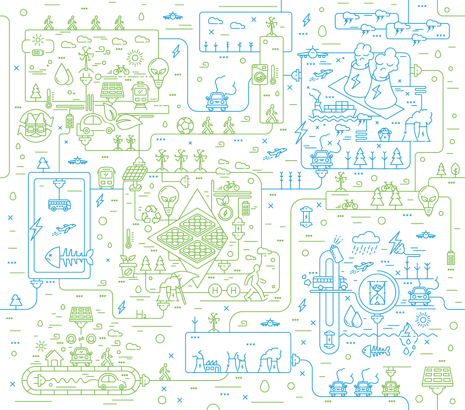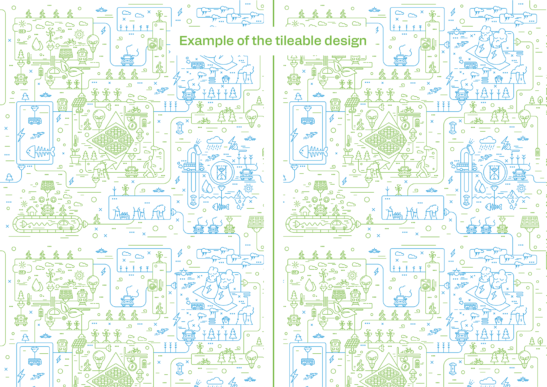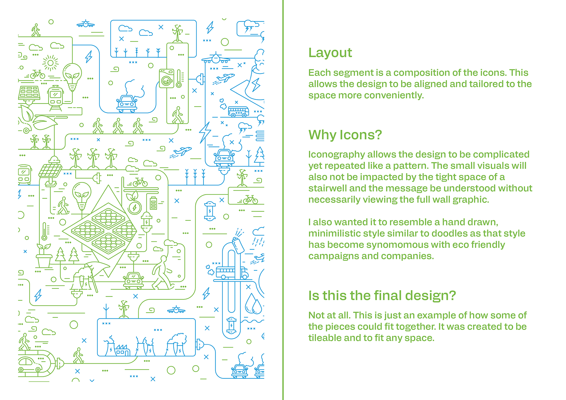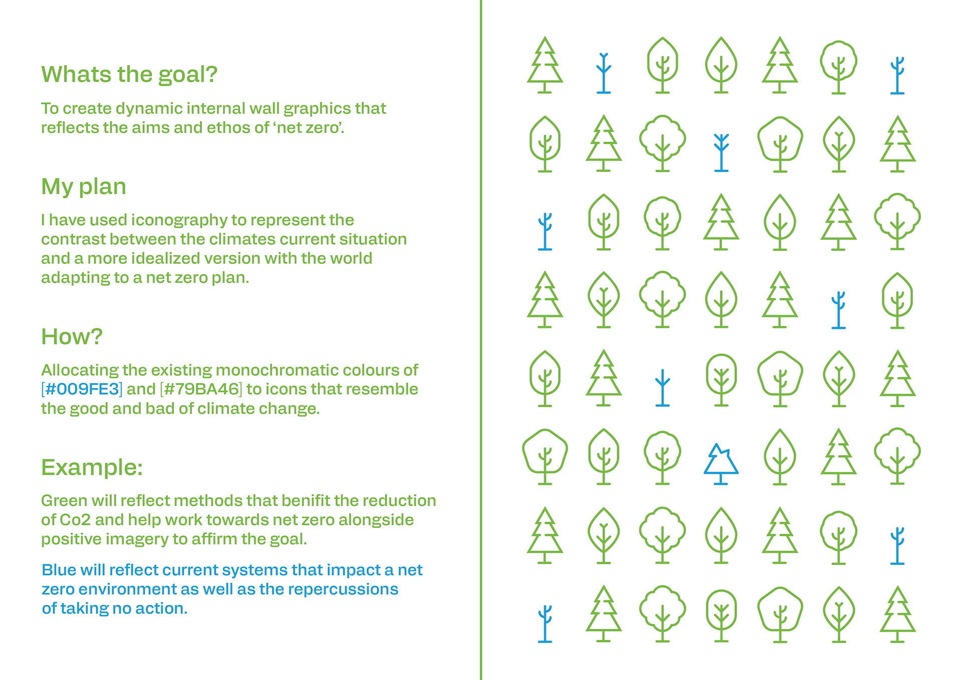 My Solution was to create a tileable design which showcases the positives and negatives of a net zero initiative using layout and iconography. Edits have been made through development to include icons that represent projects that have been completed within the building.