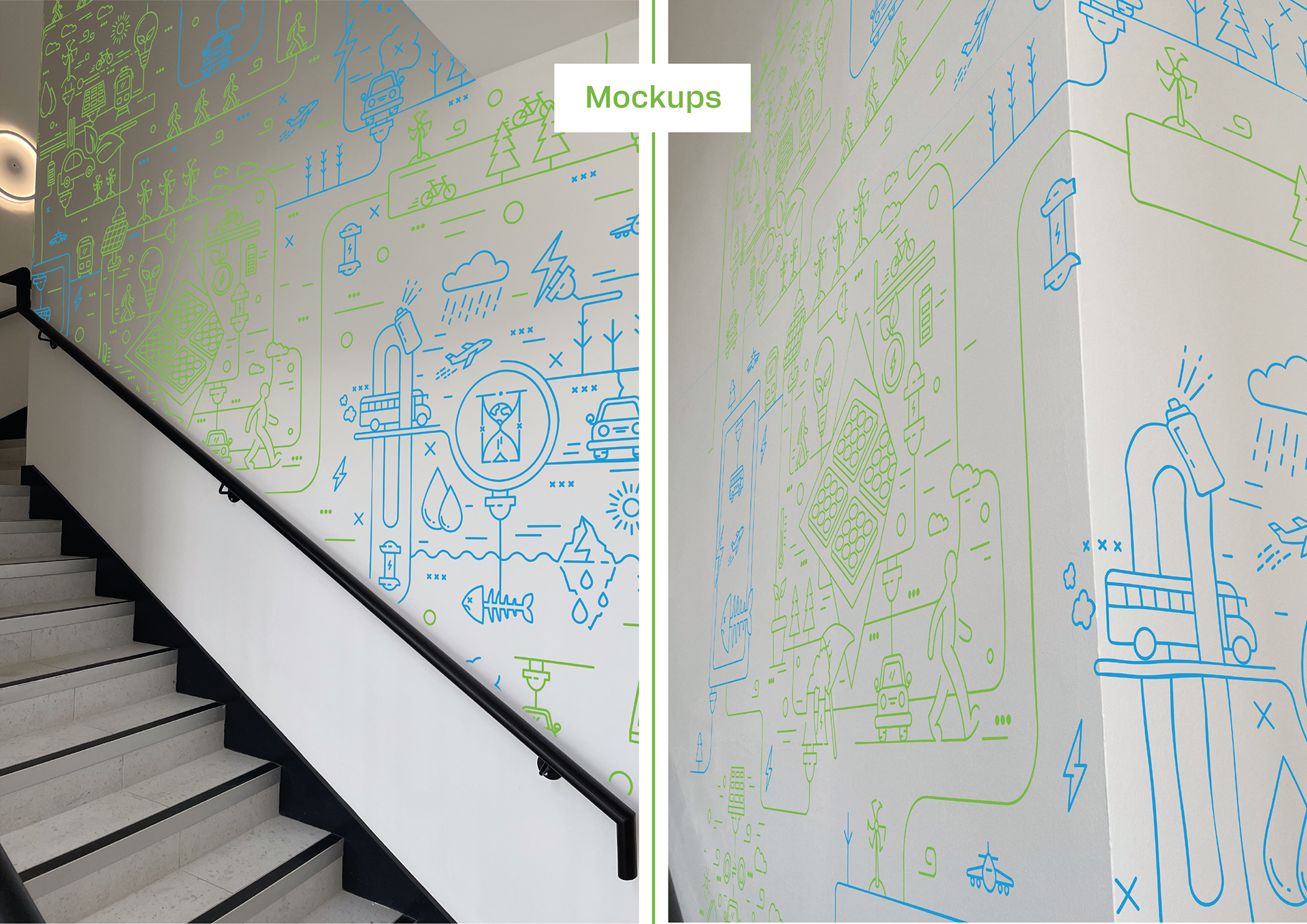 The challenge was to create dynamic internal wall graphics that reflects the aims and ethos of "Net Zero". The wall graphic was planned to be spread up a multiple story staircase within the Net Zero building.
